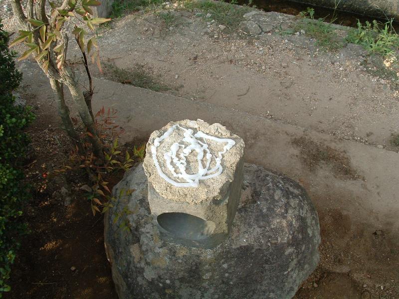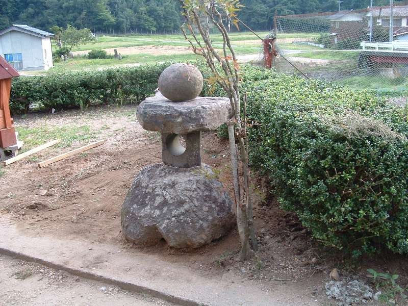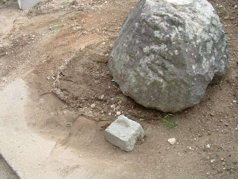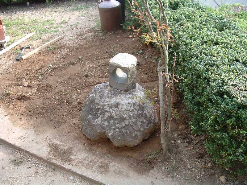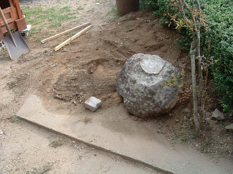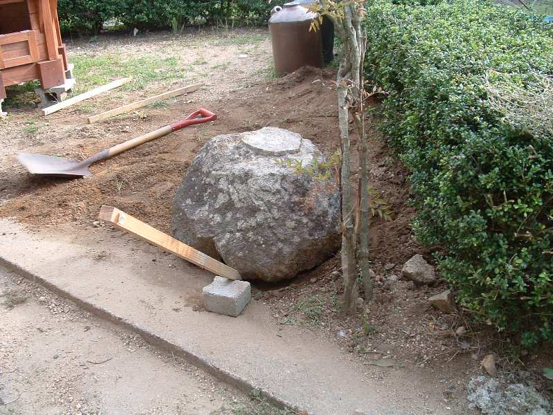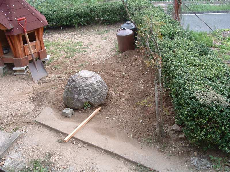 ここに見える石は、裏庭に小さな庭園を造った時の灯籠の土台です。 これからこの石を右側に移動します。道具は丁張り用の杭と煉瓦の切れ端です。