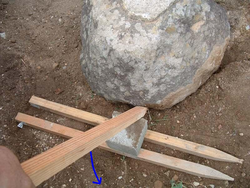 杭の頭を石の下に差し込み、杭を押さえて少し石を浮かせます。
