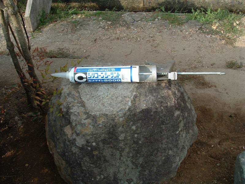 普通、石を据える時はモルタルでとめますが、以前つけたモルタルがついているのでシリコンシーラントを試しました。